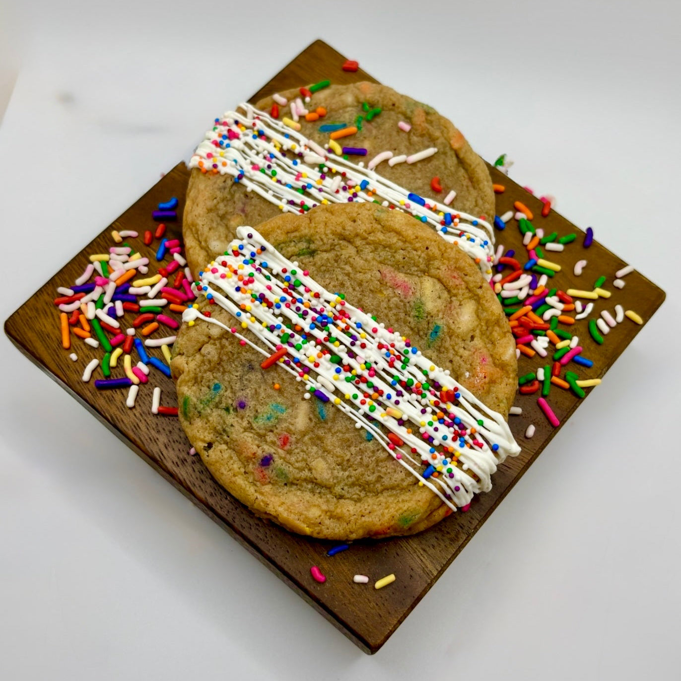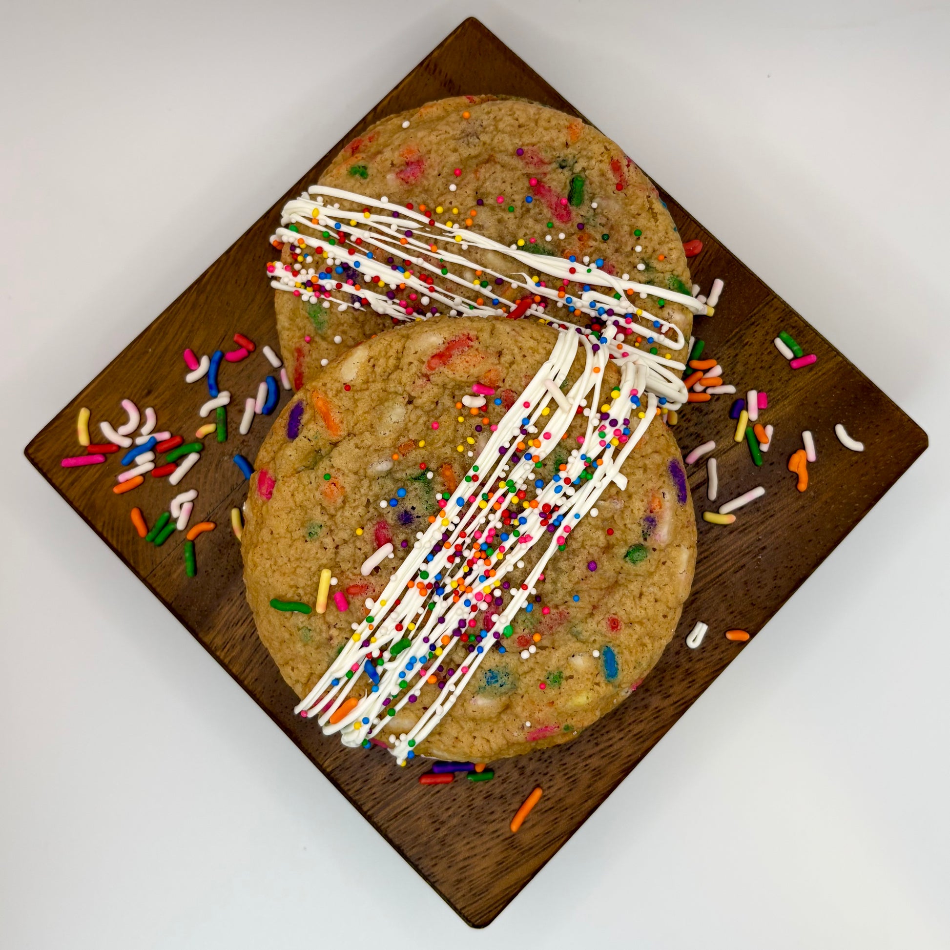 Enjoy a vibrant burst of sweetness with this signature birthday cookie, featuring classic rainbow sprinkles, a white chocolate drizzle, and mini rainbow pearls. Each bite delivers a festive celebration, perfect for any day of the year. Each cookie box includes 6 individually wrapped cookies, ensuring freshness and convenience.